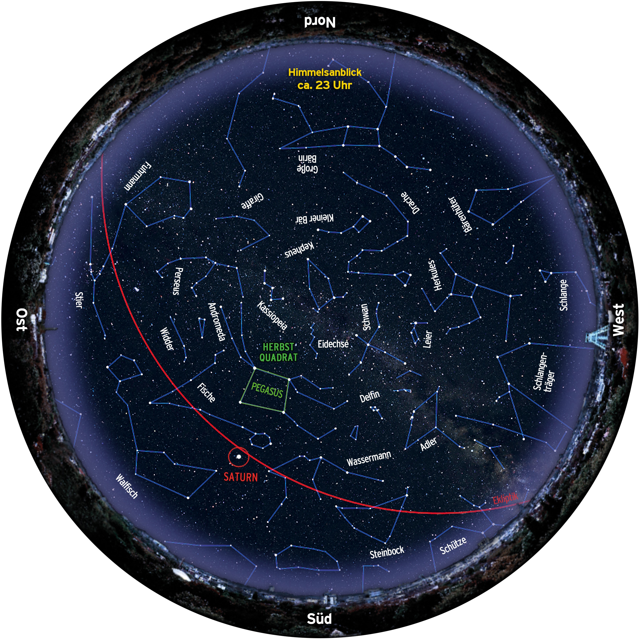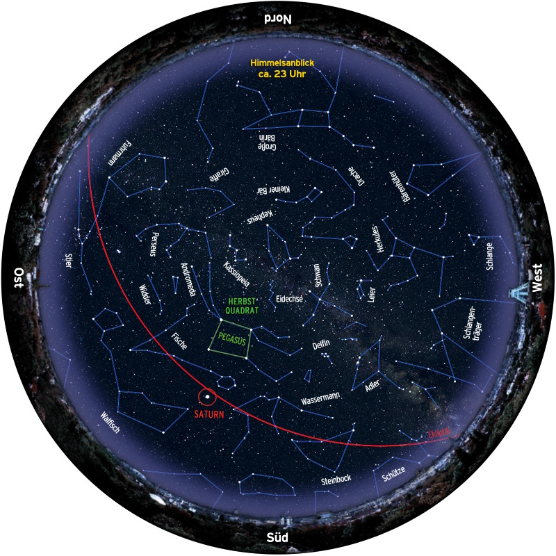 Gegen 21 Uhr oder 22 Uhr MESZ präsentiert sich der Himmel im Südwesten noch sommerlich: Das Sommerdreieck mit den Sternbildern Schwan, Leier und Adler geht erst weit nach Mitternacht unter. Im Südosten und Süden stehen aber schon die Sternbilder gut sichtbar Himmel, die uns durch die gesamte Herbstnacht begleiten.